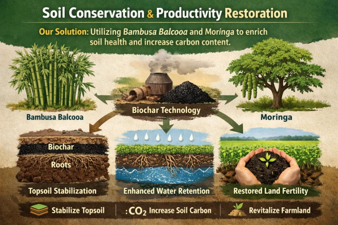 ● Our Solution: Utilizing Bambusa Balcooa and Moringa to enrich soil health and increase carbon content. We apply innovative Biochar technology to stabilize topsoil, enhance water retention, and restore long-term land fertility.