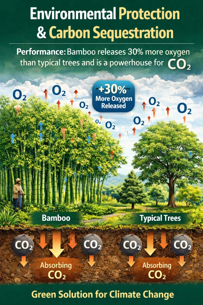 ● Performance: Bamboo releases 30% more oxygen than typical trees and is a powerhouse for absorbing CO_2.